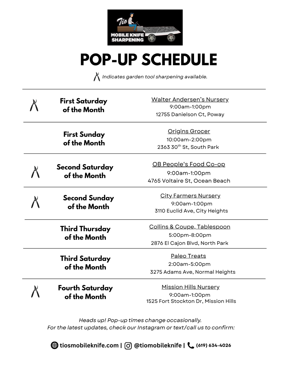 Catch us around San Diego at our monthly pop-ups. From grocery stores to plant nurseries, we love bringing sharp tools closer to you.
